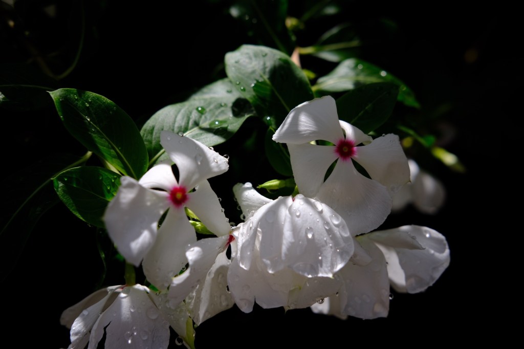 Những vệt nắng chiều xuyên nhẹ qua tán lá, len lách giữa vệt mưa. Giọt mưa chiều đọng lại sau cơn mưa rào xối xả, vương lại trên nhành hoa.